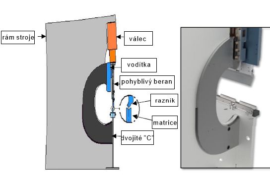 Patentovaný systém vedení beranu. Standardní uchycení vodítek k rámu stroje bylo nahrazenou uchycením ke dvěma C profilům nezávisle připevněným k rámu stroje pouze na spodní části rámu, kde nejsou ovlivněny deformací rámu při ohybu. Písty jsou uchyceny k beranu na kulovitých pouzdrech. Tímto systémem je zajištěna dokonalá kolmost pohybu beranu vůči stolu i v tlaku.
